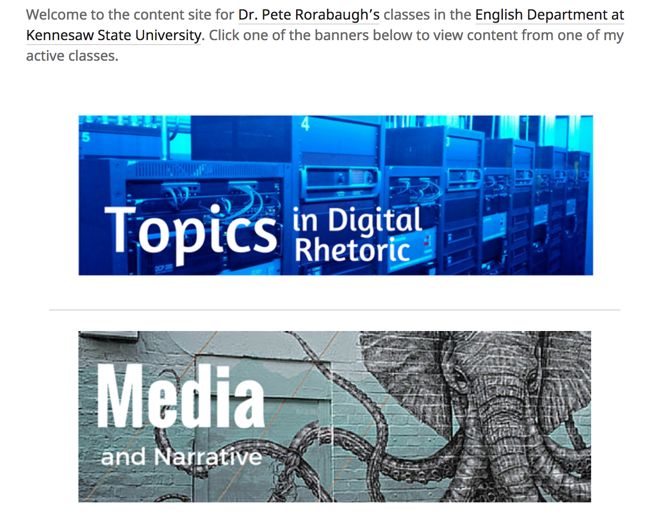 By employing the blog on your main domain (broken into categories for classes) or on a standalone subdomain (like this one), you can maintain a regularly updated list of assignments, readings, and reflections for particular classes. Publish one or two blog posts per week per class outlining the upcoming topics, submission guidelines and due dates, and readings (with hyperlinks) to your blog. Treat your class site as the “official register” of what is happening in class. The benefit of using your site as a pedagogical resource — outside of or in addition to Moodle — is twofold. Because it’s public, you can share what you’re doing in class with the world beyond the classroom, and you can model for students how to involve digital components in the learning process. Here’s an example of mine.