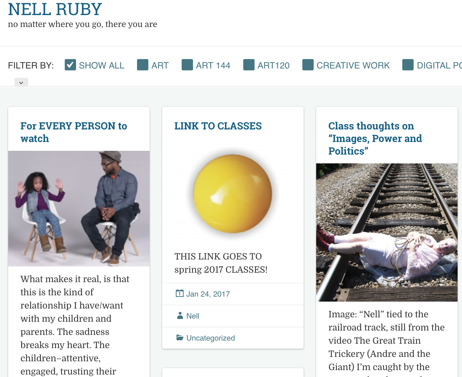 Your main domain (yourname.agnesscott.edu) offers you a place to introduce yourself, your research, and your teaching to the digital world. You can start a reflective blog, build an About page, and showcase your publications and presentations. In a matter of minutes you can write a short bio and publish a live Google Doc of your CV. You have the choice to make your main domain point to a static page (probably your About page) or to a list of regularly updated posts. Here’s an example of Nell Ruby’s main domain.